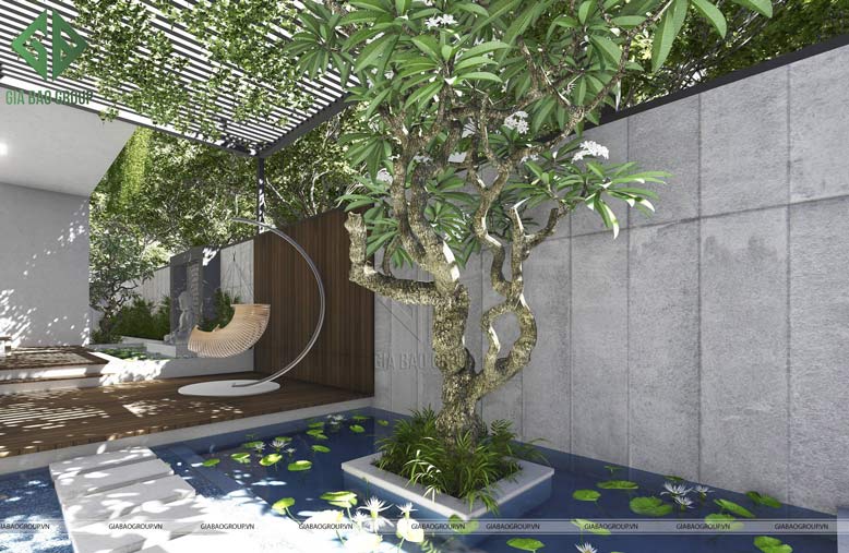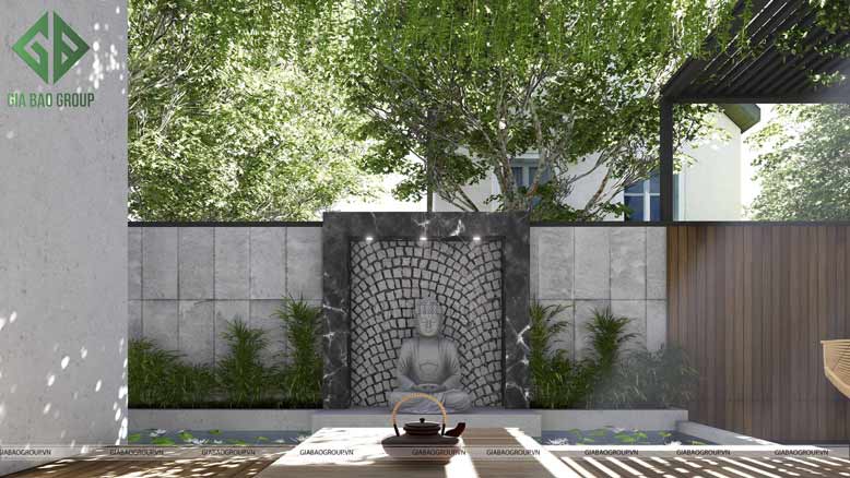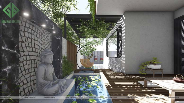 Là điểm nhấn của ngôi nhà, cũng như niềm tự hào của đội ngũ thiết kế bởi nó lột tả được không khí Zen–Thiền mà gia chủ ưa thích. Ngoài phần sân vườn mặt tiền khá rộng rãi và thoáng đãng, thích hợp cho những bữa tiệc ngoài trời cùng gia đình hoặc bè bạn, và gara xe hơi có mái che nối từ đường dẫn cổng vào, thì bên hông ngôi nhà, chính là một không gian đầy tĩnh tại tôn vinh sự thư thái trong tâm hồn.