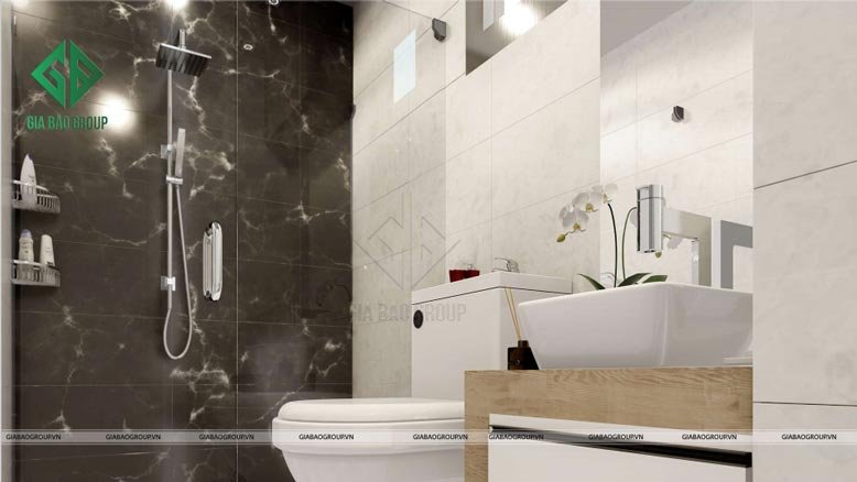 Khu vực tắm có ốp gạch tối màu vân trắng, gợi cảm giác về sự độc đáo, thú vị. Khu vực này cũng được trang bị đầy đủ các đồ dùng như vòi sen, vòi tắm đứng.