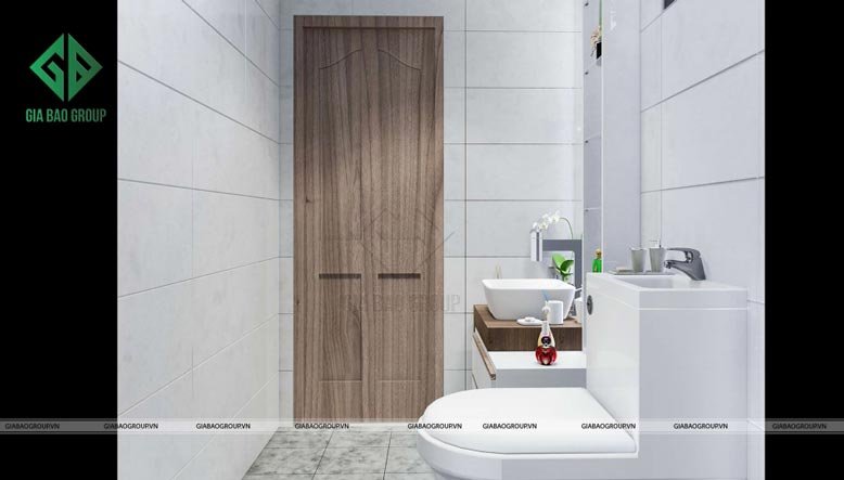 Phòng vệ sinh của mẫu nội thất nhà phố tân cổ điển tập trung vào sự tiện nghi, trang bị đồ nội thất cao cấp và đắt tiền. Tường được ốp gạch trắng sạch sẽ, mát mẻ. Lavabo, tủ, bồn cầu từ những thương hiệu cao cấp, mang lại sự thoải mái cho người dùng.