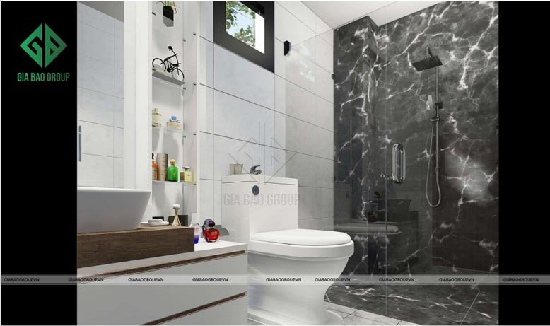 Phòng được trang bị thêm kệ nhỏ gắn tường, giúp gia chủ để đồ thoải mái mà không lo bị nước văng vào. Vách ngăn kính ngăn giữa khu vực giữa tay khô và khu vực nhà tắm, giúp Không Gian vừa sạch sẽ lại vừa hiện đại và tiện lợi.
