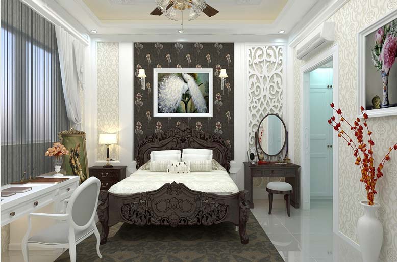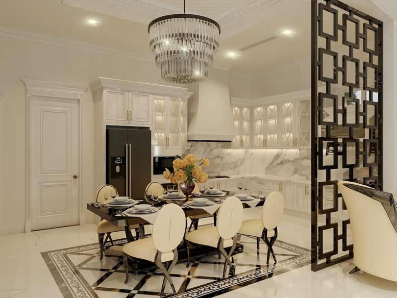 Nội thất biệt thự tân cổ điển dùng màu trắng để làm chủ đạo kết hợp với nội thất đen để tạo sự khác biệt. Sự kết hợp này đã mang đến một sức hút bất ngờ bởi sự thanh lịch, mạnh mẽ hơn.