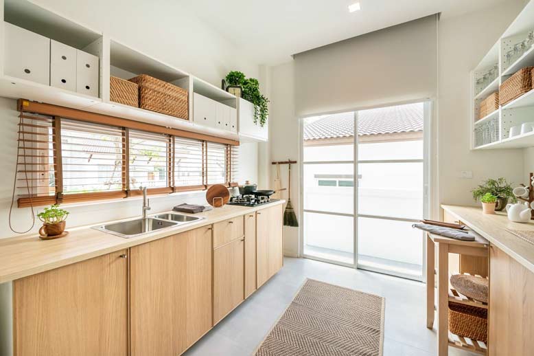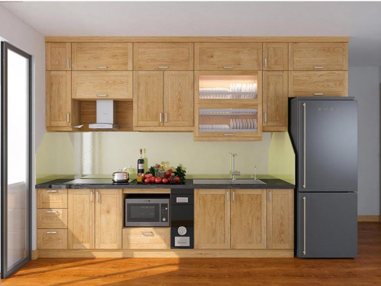 Khu vực bếp được thiết kế cửa giúp việc lưu thông gió. Chúng làm cho không gian luôn thoáng mát và không bị bí bách. Khi bạn chọn sử dụng gỗ cho không gian bếp, bạn cần ưu tiên chất liệu gỗ tốt.