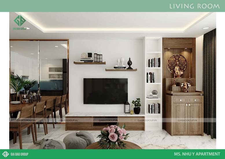 Trong thi công nội thất trọn gói căn hộ chung cư, các KTS cũng bố trí màu sắc cho từng phòng chức năng khác nhau. Phòng khách cần ấm áp, nhưng vẫn tươi mới để chào đón khách đến nhà.