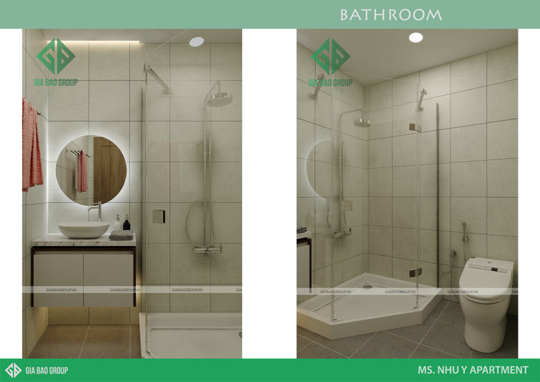 Điểm xuyết cho bức tường trắng là một tấm gương tròn nhỏ treo tường. Xung quanh chúng còn được trang trí bằng các hình tròn xếp chồng lên nhau. Chúng tạo ra một điểm nhấn trên nền tường được ốp đá granite trắng xám.