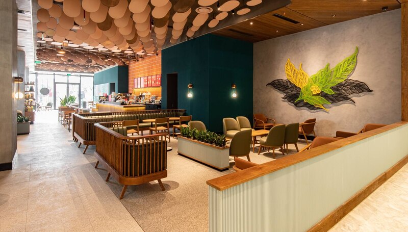 Thiết kế hiện đại sử dụng gam màu trầm và vật liệu tự nhiên phù hợp cho quán quy mô lớn