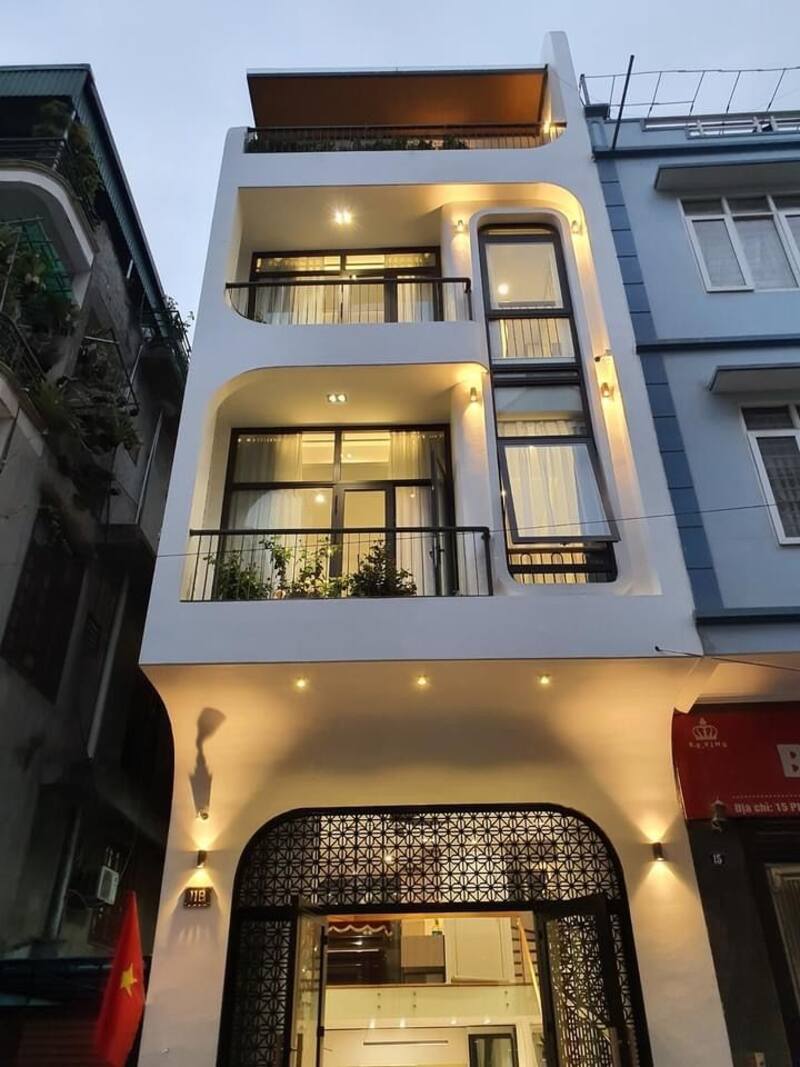Nhà 3 tầng bo cong độc đáo, phong cách hiện đại, gam trắng chủ đạo.