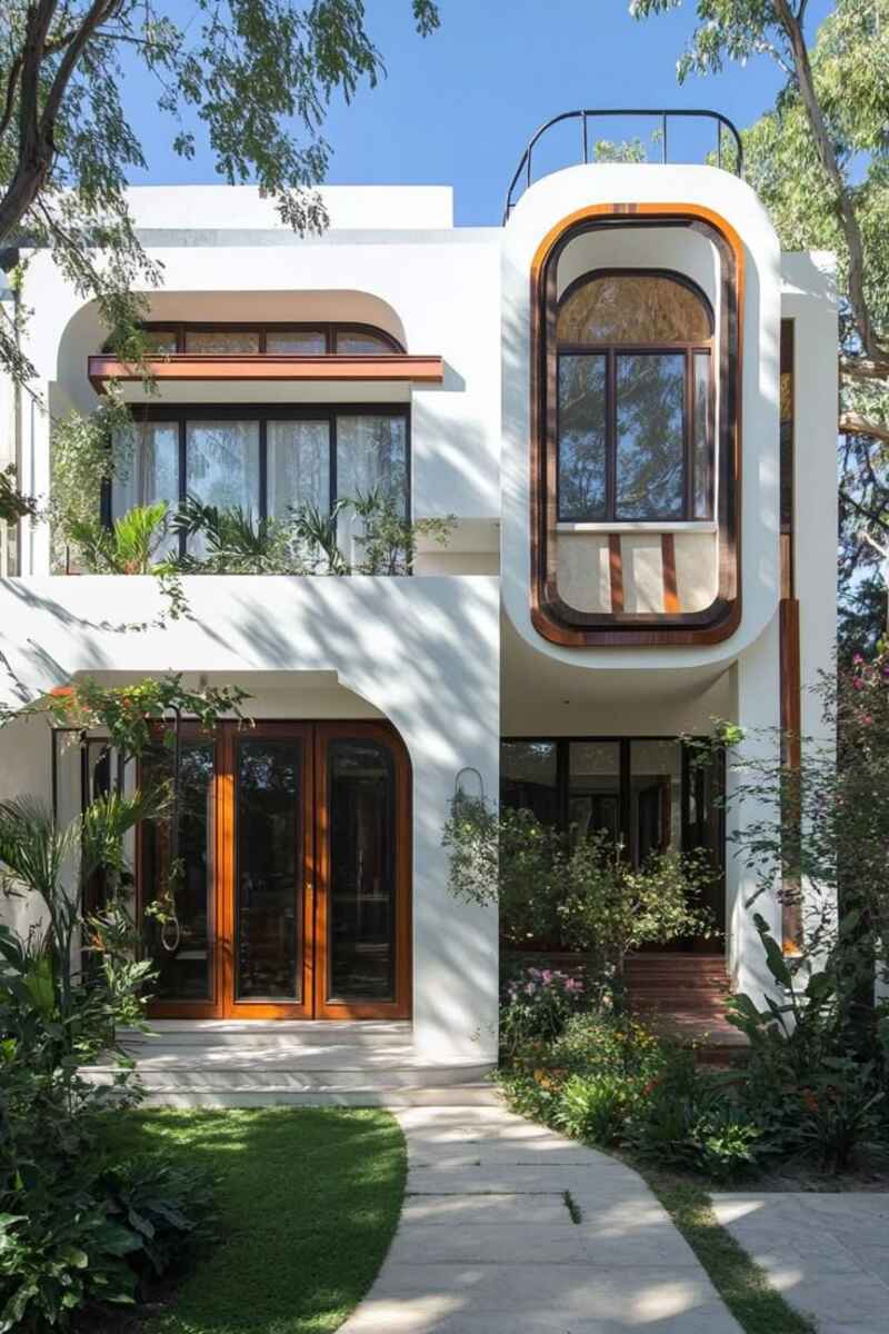 Biệt thự mini 2 tầng hiện đại, bo cong mềm mại, nhiều cây xanh.