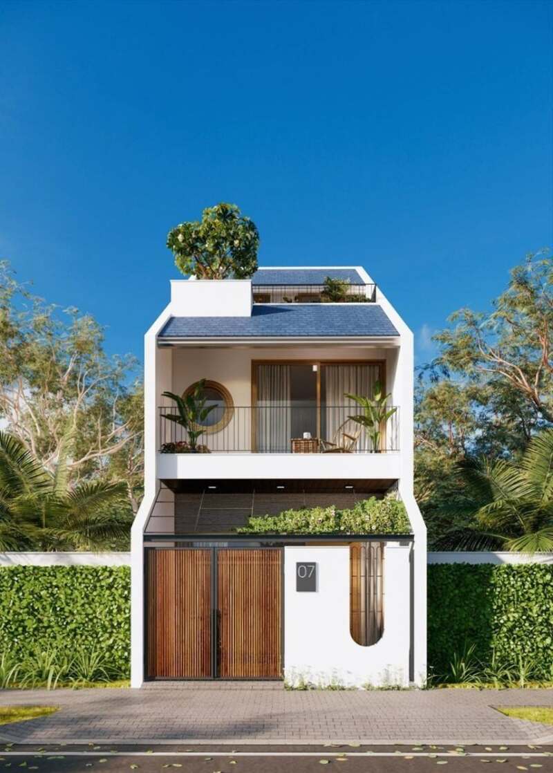 Nhà phố 3 tầng mái bằng, mặt tiền tối giản, kết hợp gỗ và cây xanh.