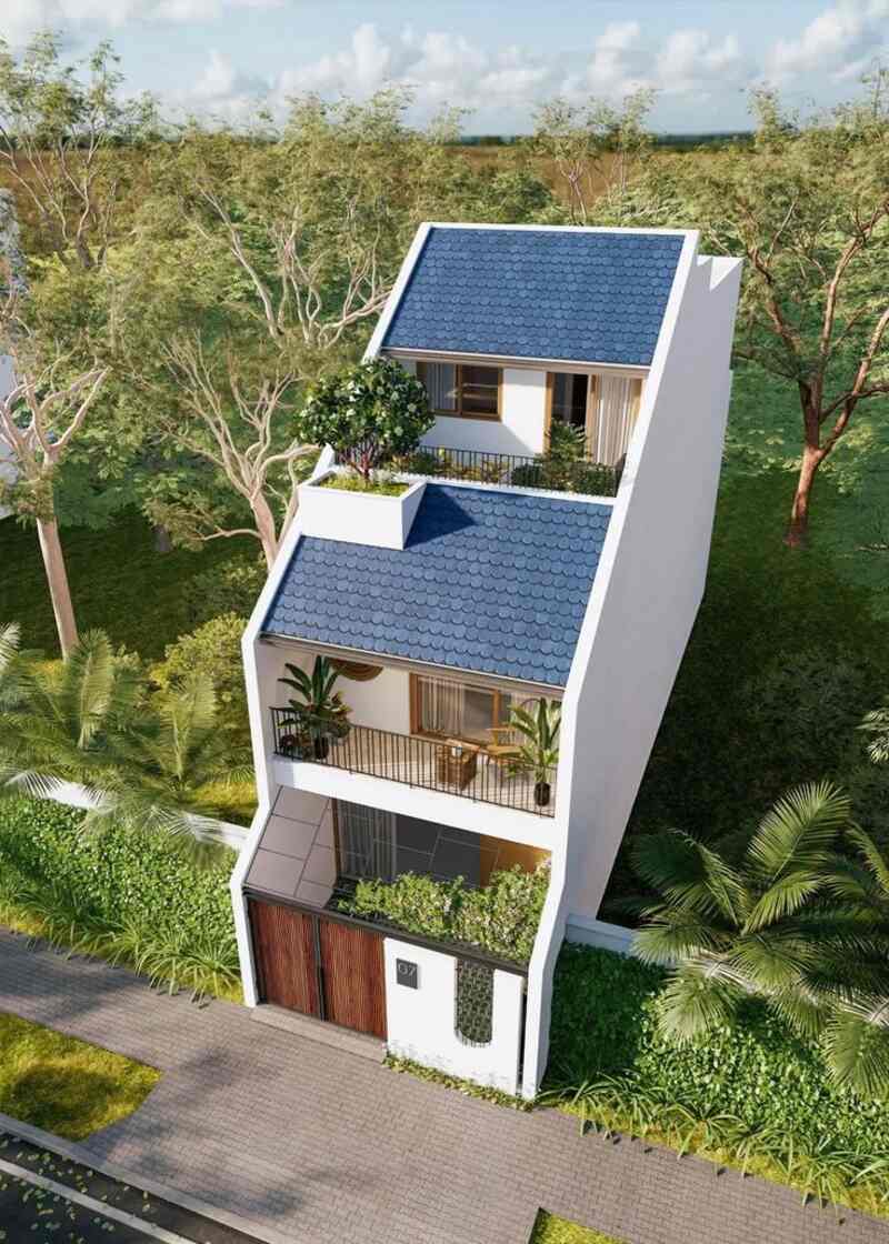 Nhà phố 3 tầng mái lệch, phối cảnh nhìn từ trên cao, có sân thượng xanh.
