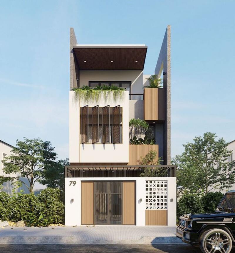 Nhà phố hiện đại 3 tầng, mặt tiền 5m, lam gỗ và chi tiết trang trí bắt mắt.